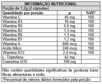 Coenzima Q10, ácido ascórbico (vitamina C), L-Triptofano, Nicotinamida (vitamina B3), D-Pantotenato de Cálcio (vitamina B5), Riboflavina (vitamina B2) Cloridrato de Pridoxina (vitamina B6), Tiamina (vitamina B1), Palmitato de Retinila (vitamina A), Ácido Fólico, Cianocobalamina (vitamina B12) antiumectante, Carbonato de Cálcio e caápcula (gelatina).
