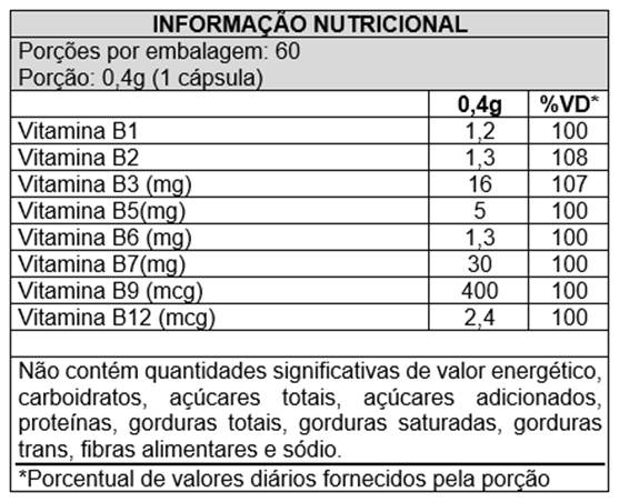 Óleo de girassol, gelatina, nicotinamida, água purificada, D-pantotenato de cálcio, cloridrato de piridoxina, mononitrato de tiamina, riboflavina, ácido fólico, D-biotina, cianocobalamina, umectante glicerina, emulsificante lecitina de girassol, estabilizante cera de abelha e corantes dióxido de titânio, amarelo quinoleina, azul brilhante e amarelo crepúsculo.