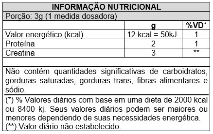 Importante: O consumo de creatina acima de 3g ao dia pode ser prejudicial à saúde. Este produto não substitui uma alimentação equilibrada, e o seu consumo deve ser orientado por nutricionista ou médico. Não deve ser consumido por crianças, gestantes, idosos e portadores de enfermidades.