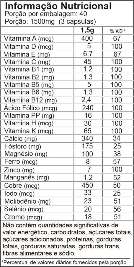 Vitamina A, Vitamina C, Vitamina D, Vitamina E, Vitamina B1, Vitamina B2, Vitamina PP, Vitamina B5, Vitamina B6, Ácido Fólico, Vitamina B12, Vitamina H, Vitamina K, Ferro, Cromo, Zinco, Cobre, Iodo, Manganês, Molibdênio, Selênio, Cálcio, Fósforo e Magnésio.