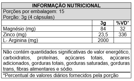 L- Arginina, Magnésio bisglicinato, Zinco bisglicinato e antiumectante dióxido de silício e capsula de gelatina dura (veículos gelatina e agua bi-filtrada, acidulante ácido cítrico e corante inorgânico dióxido de titânio)