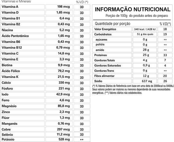 SABOR BAUNILHA: Proteína concentrada do soro de leite, proteína concentrada de soja desengordurada, fibra psyllium (plantago ovatae), fosfato tricálcio, óxido de magnésio, cloreto de potássio, cloreto de sódio, sulfato de zinco, pirofosfato de ferro, sulfato de manganês, sulfato de cobre, picolinato de cromo, iodeto de potássio, selenito de sódio, ácido ascórbico, niacina, alfa-tocoferol, pantotenato de cálcio, cloridrato de piridoxina, riboflavina, nitrato de tiamina, acetato de retinol, ácido fólico, biotina, colecalciferol, fitomenadiona, e cianocobalamina, espessante goma guar, aromatizante e edulcorante sucralose.