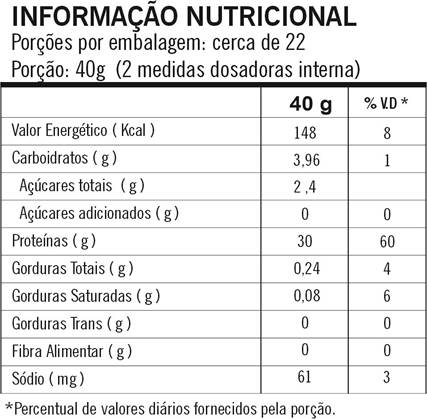 Alimento protéico de alto valor biológico e de excelente absorção promove o ganho de massa muscular magra. Com grande concentração de BCAAs e baixo teor de carboidratos (low carb). Adoçado com Splenda (sucralose), único edulcorante derivado diretamente do açúcar, e com exatamente o mesmo sabor, porém sem as calorias.