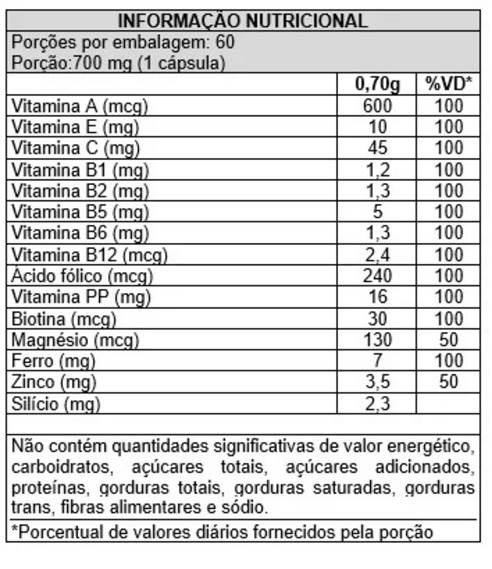 Hair, Skin & Nails Stay Well (Brinde): Vitamina A (Acetato de Retinol), Vitamina C (Ácido Ascórbico), Vitamina E (Acetato de Tocoferol), Vitamina B1 (Nitrato da Tiamina), Vitamina B2 (Riboflavina), Vitamina PP (Nicotinamida), Vitamina B5 (Pantotenato de Cálcio), Vitamina B6 (Piridoxina), Ácido Fólico, Vitamina B12 (Cianocobalamina), Vitamina H (Biotina), Ferro (Fumarato Ferroso), Zinco (Óxido de Zinco), Magnésio (Óxido de Magnésio), Silício (Dióxido de Silício) e cápsula (gelatina).
